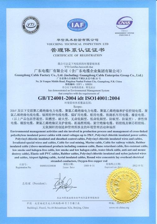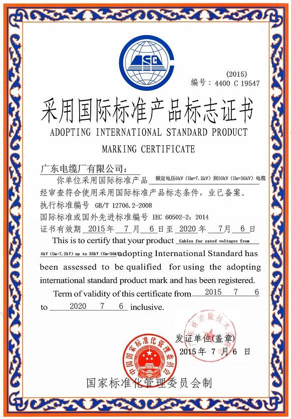 廣東省采用國(guó)際標(biāo)準(zhǔn)產(chǎn)品認(rèn)可證書(6-30kV)